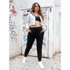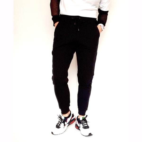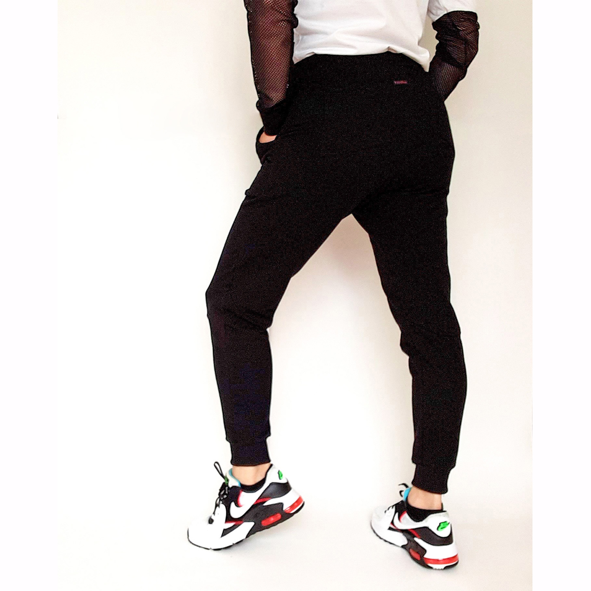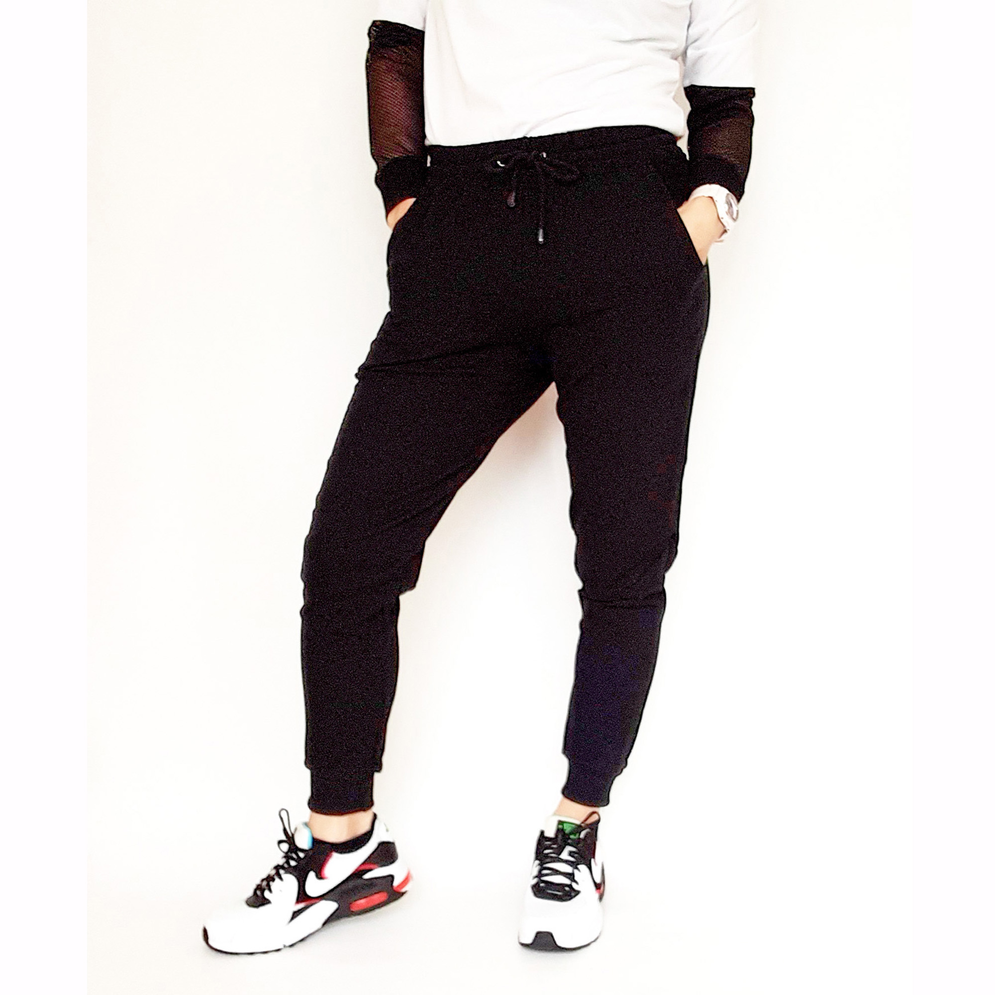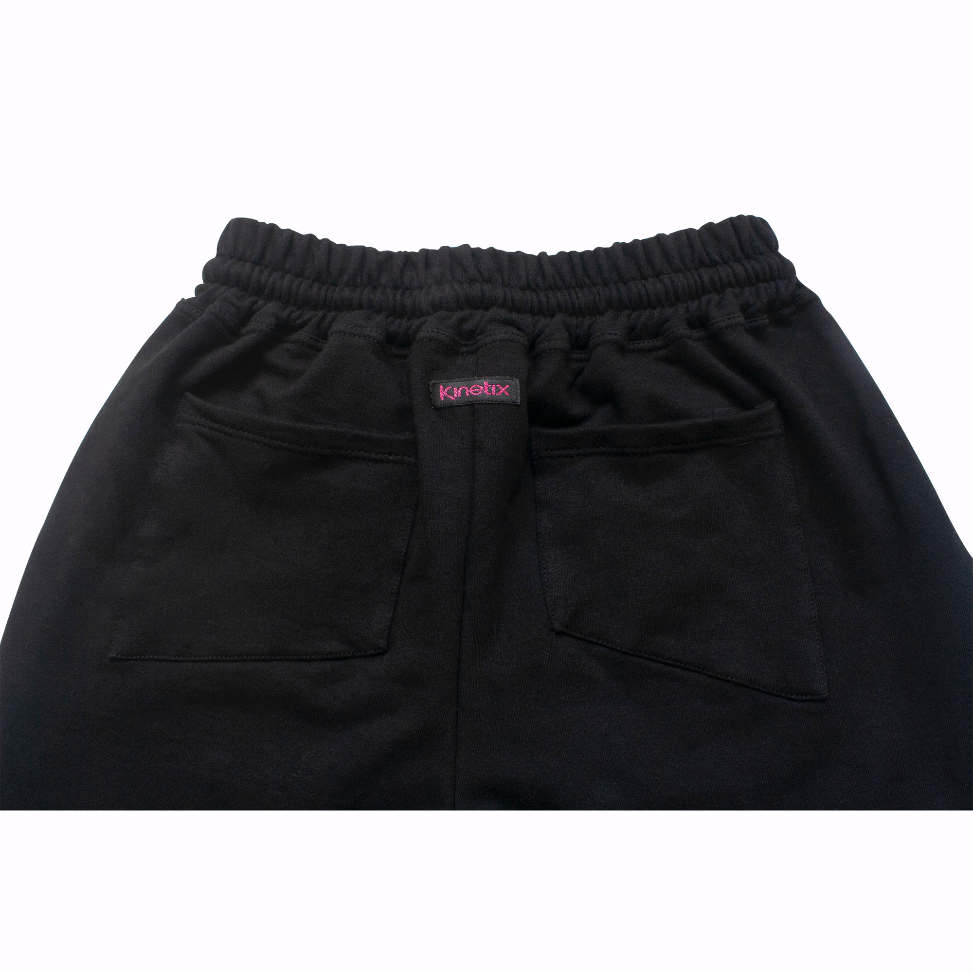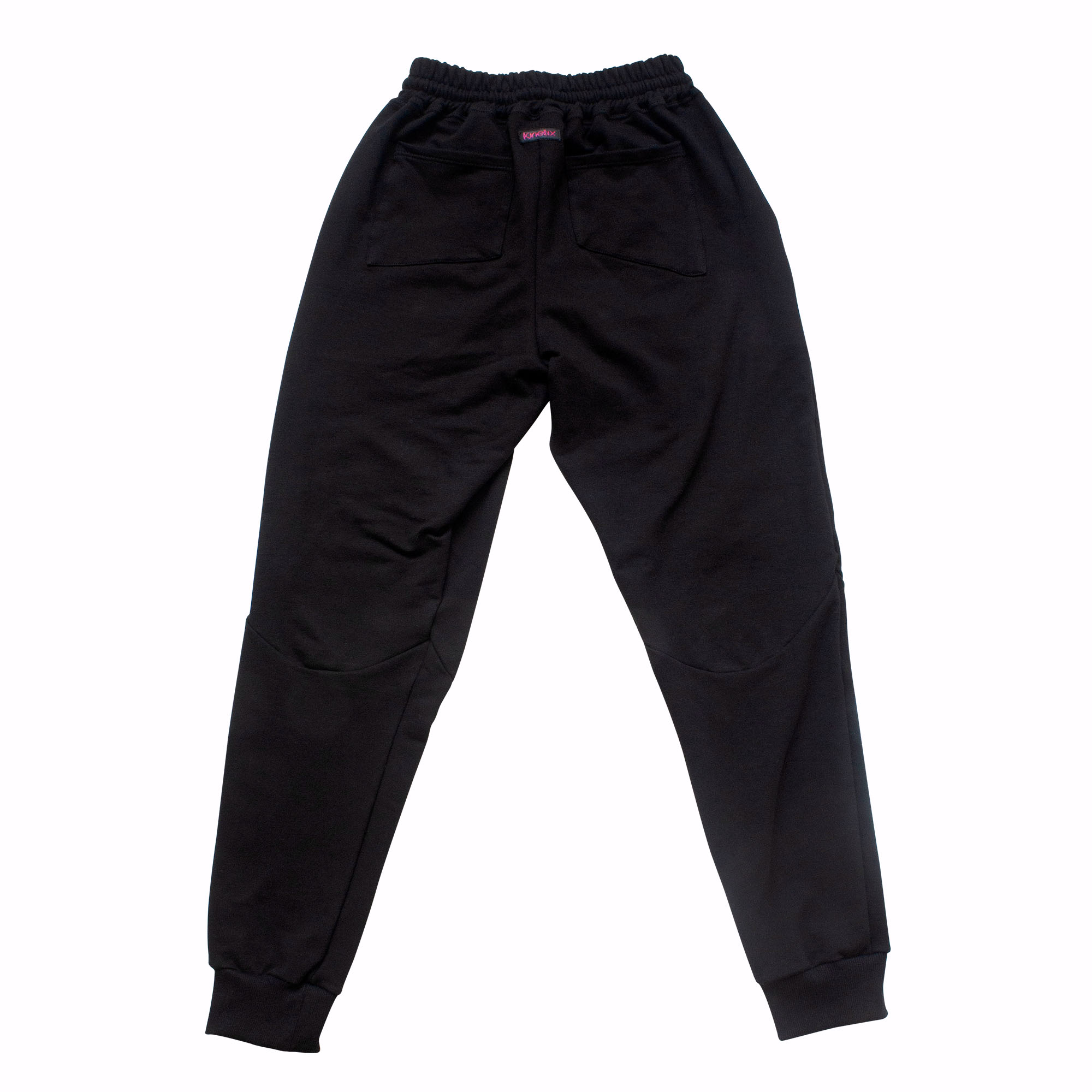 Jogger cómodo, de tiro medio para tus entrenamientos, clases de danza o para diario, de algodón con spandex color negro con detalle de costuras, bolsillos funcionales en delantero y espalda, pretina con elástico y cordones regulables de algodón.