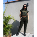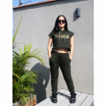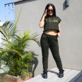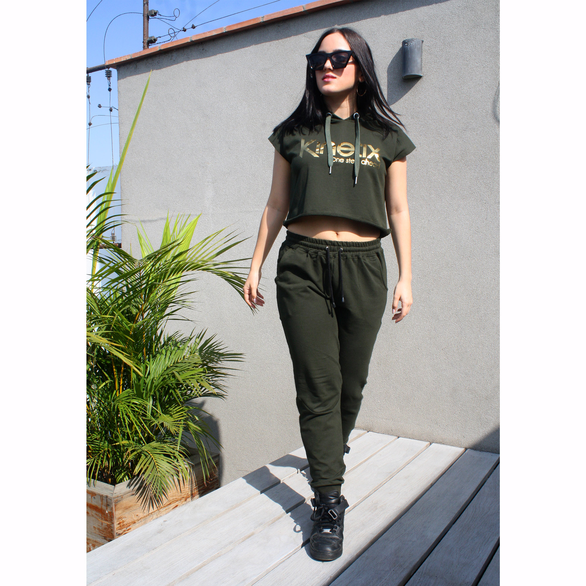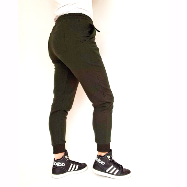 Jogger cómodo, de tiro medio para tus entrenamientos, clases de danza o para diario, de algodón con spandex color verde militar con detalle de costuras, bolsillos funcionales en delantero y espalda, pretina con elástico y cordones regulables de algodón.