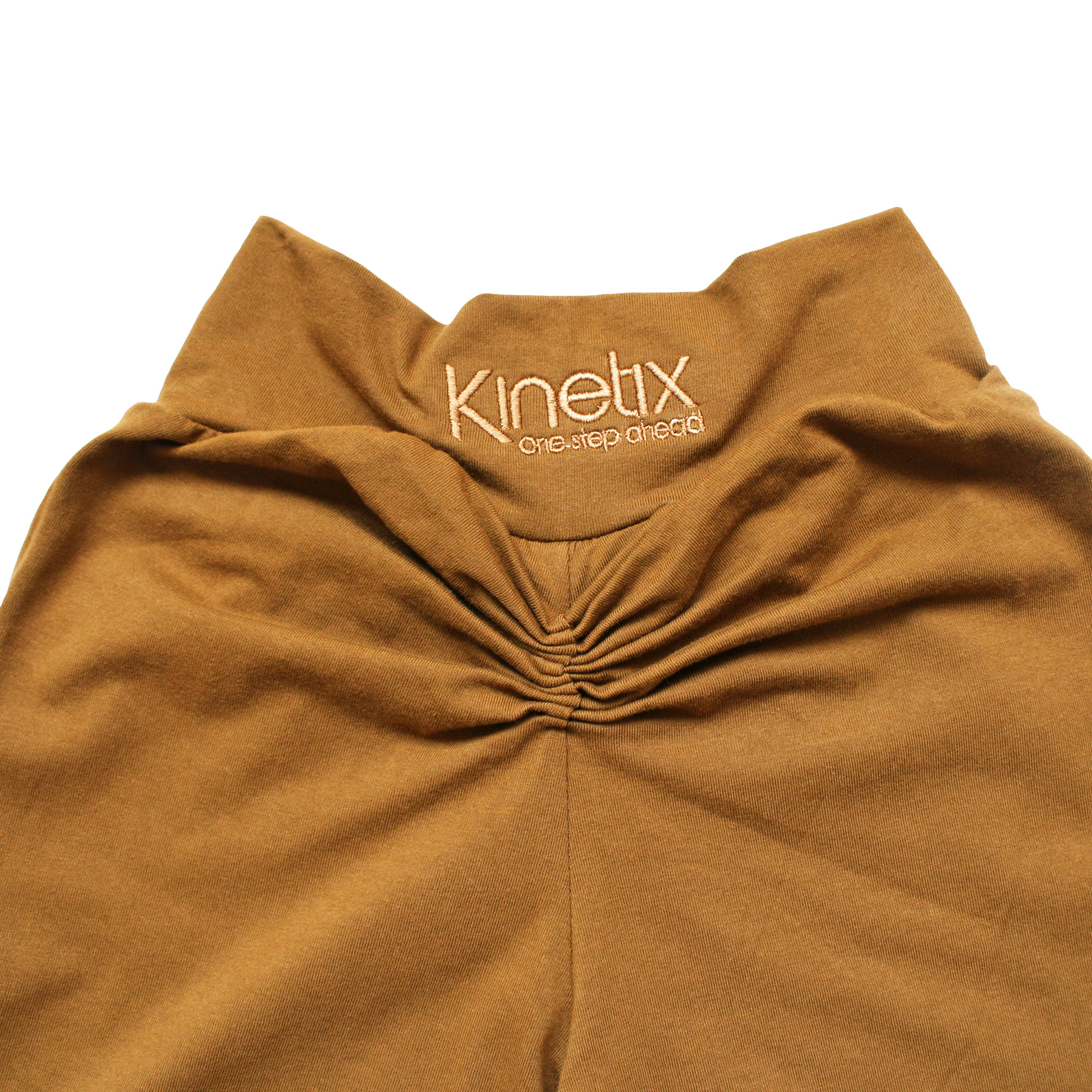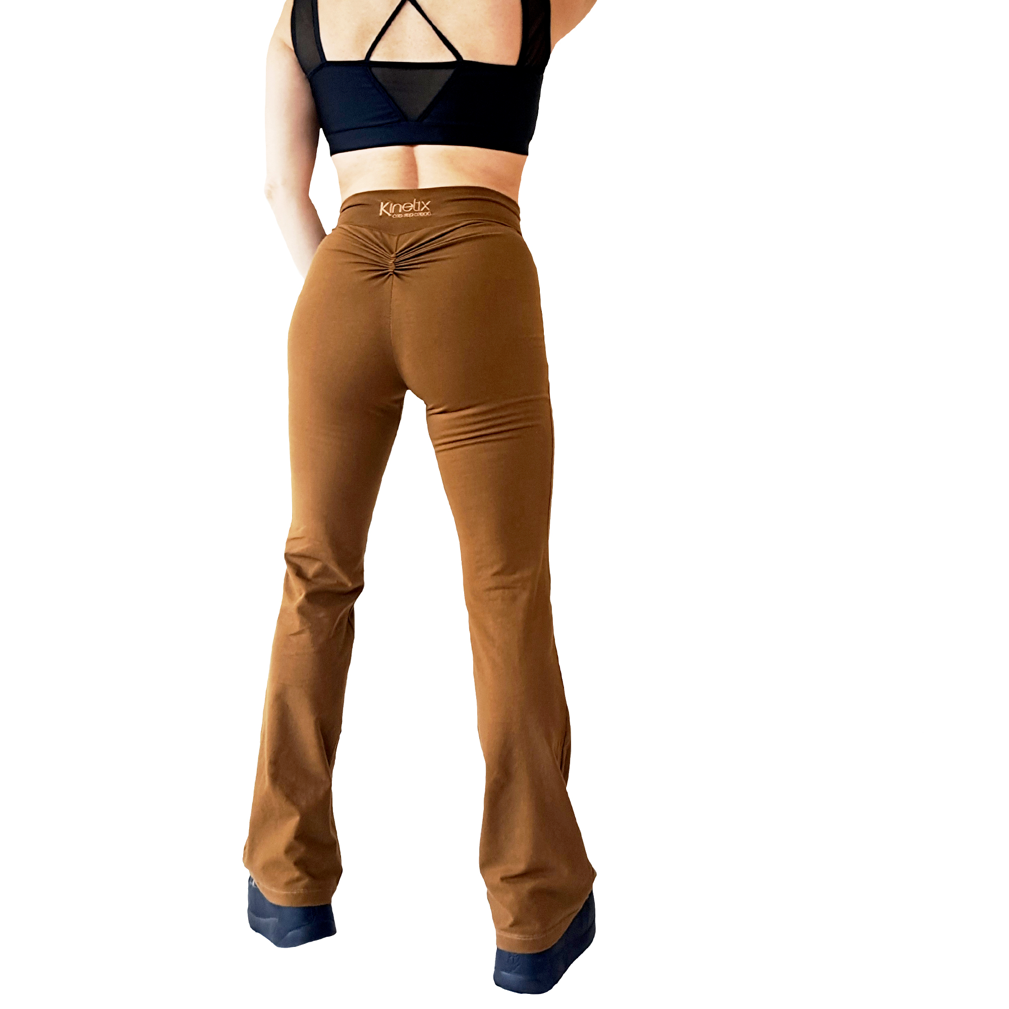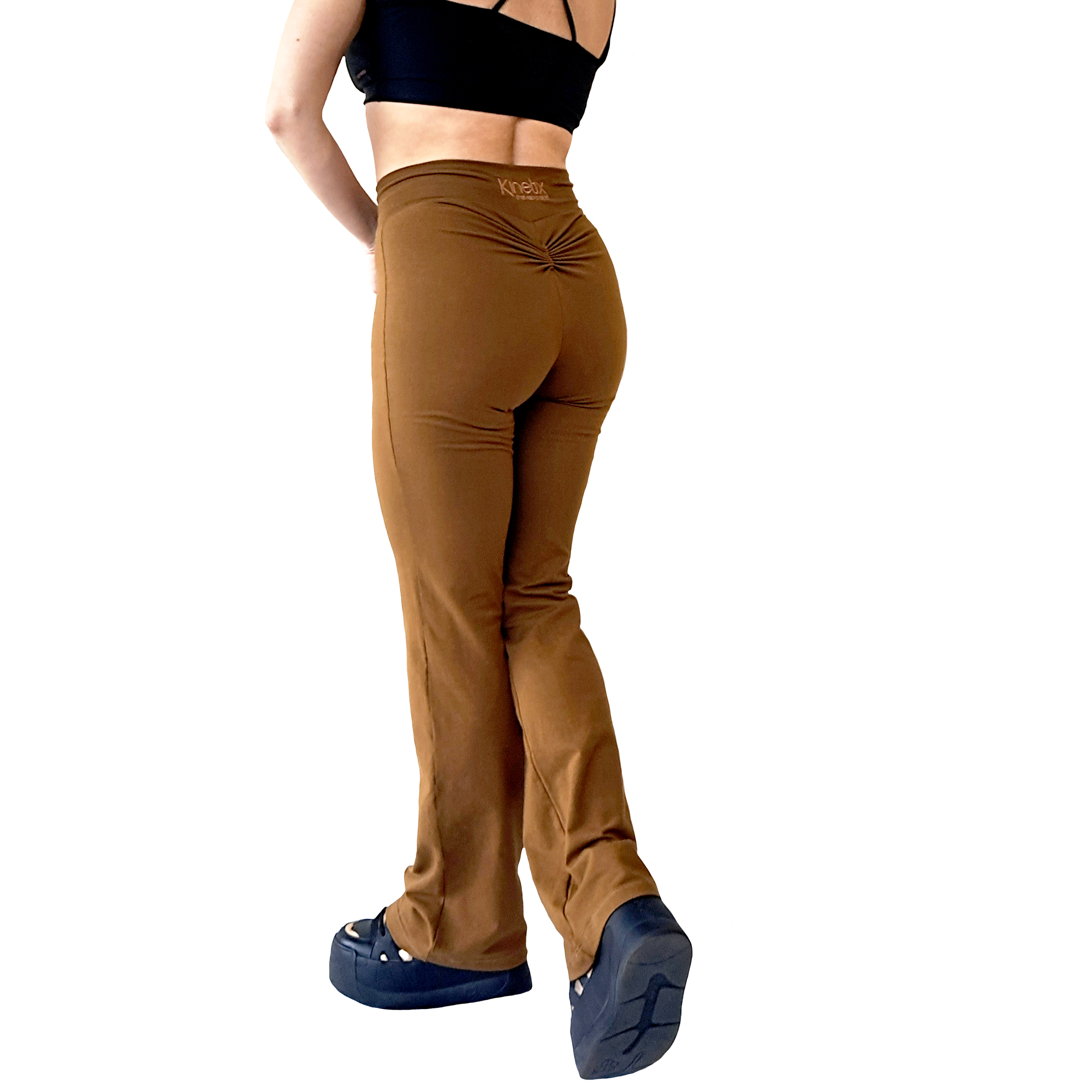Pantalón de algodón suave al tacto con spandex (no trasluce), color toffee con pretina cruzada a la cintura, tiro alto y botapie semi-acampanado de largo hasta el talón. Detalle de bordado con el logo de la marca con hilo a tono en la espalda y fruncido para mejor forma anatómica y talle.