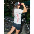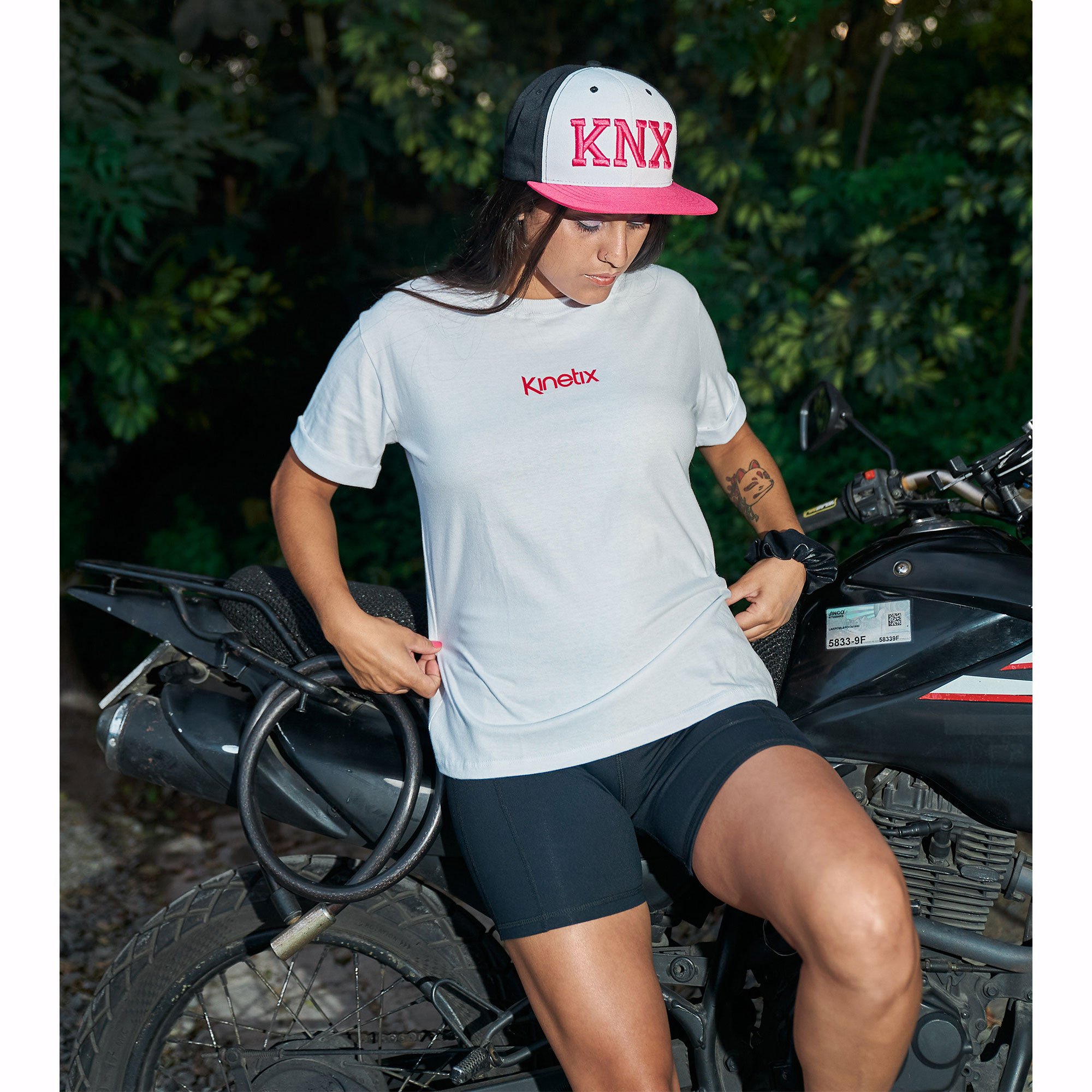 Polo de manga corta doblada, color blanco, suelto y fresco de 100% algodón, con estampado de logo Kinetix en delantera y slogan One Step Ahead en espalda en color magenta. Combínalo con: shorts, leggings, faldas, pantalones, joggers, poleras y casacas Kinetix.