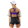 Polo traslúcido de tela tul color negro, con cuello redondo, mangas cortas, costura de hombros caídos, y aberturas a los lados.