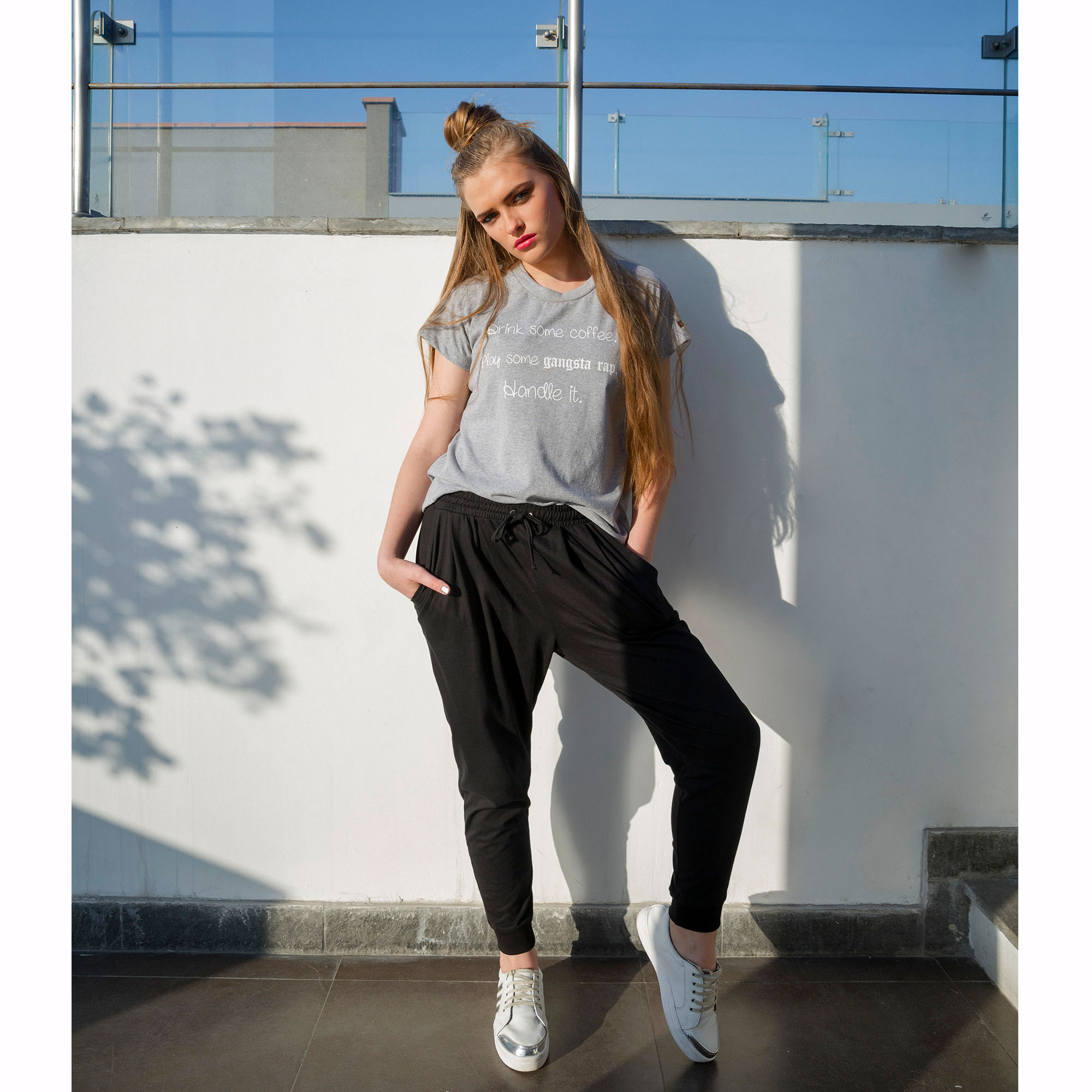 Pantalón jogger básico de 100% algodón color negro, suelto, cómodo, fresco, de tiro medio con bolsillos delanteros, pliegues para mejor talle, pretina con elástico y cordones reguladores. Largo hasta el tobillo.
