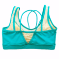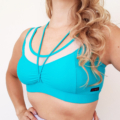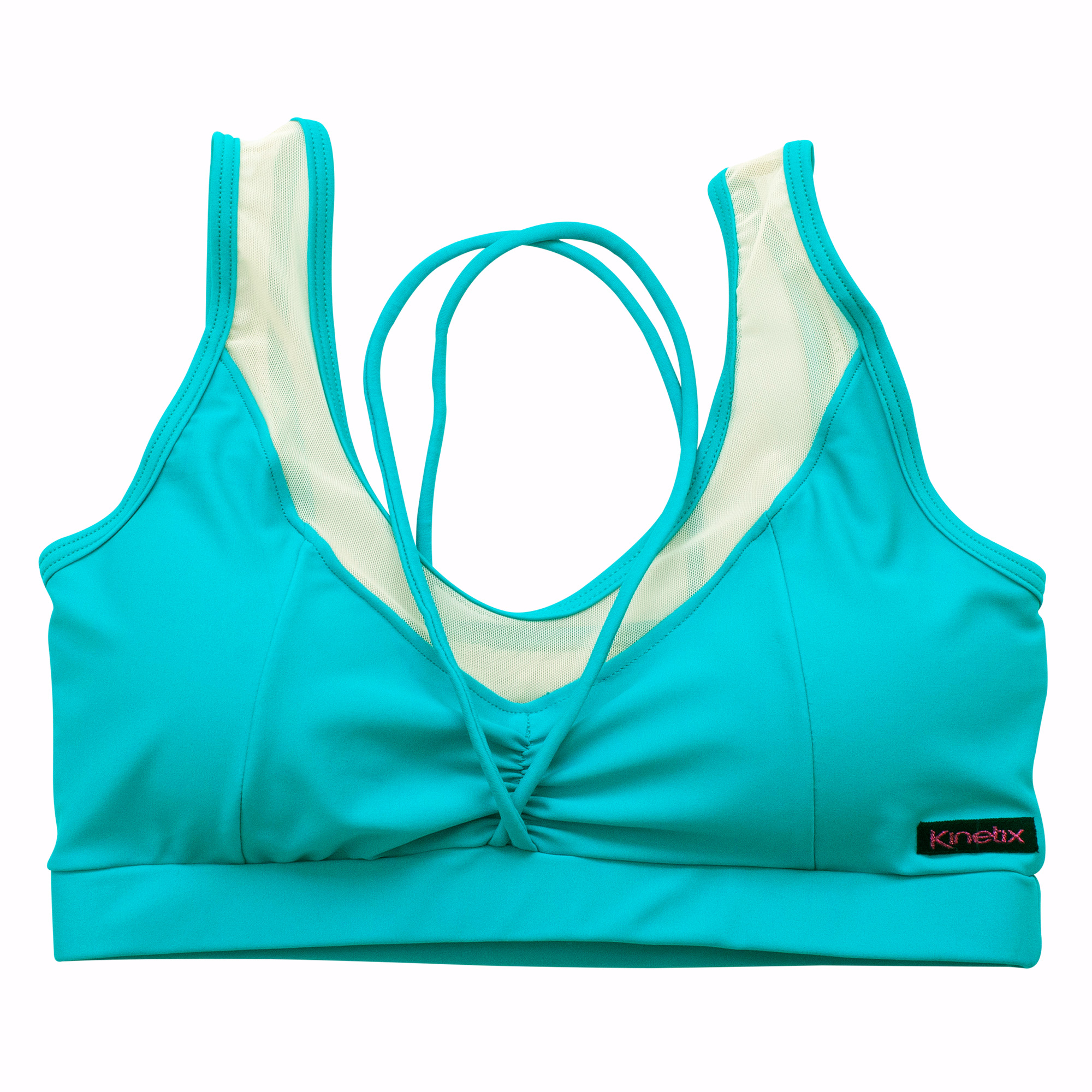 Top/sostén deportivo de telas deportivas: Lycra, forro color piel, aplicación de malla traslúcida en escote, tiras, y forma triangular en la espalda. Detalle de fruncido en delantero, copas flexibles y costuras para mejor forma anatómica; pretina con elástico para mayor soporte, y pitas cruzadas desde el delantero hasta la espalda. Ideal para tus clases de danza, entrenamientos leves y para diario con tus conjuntos Kinetix.