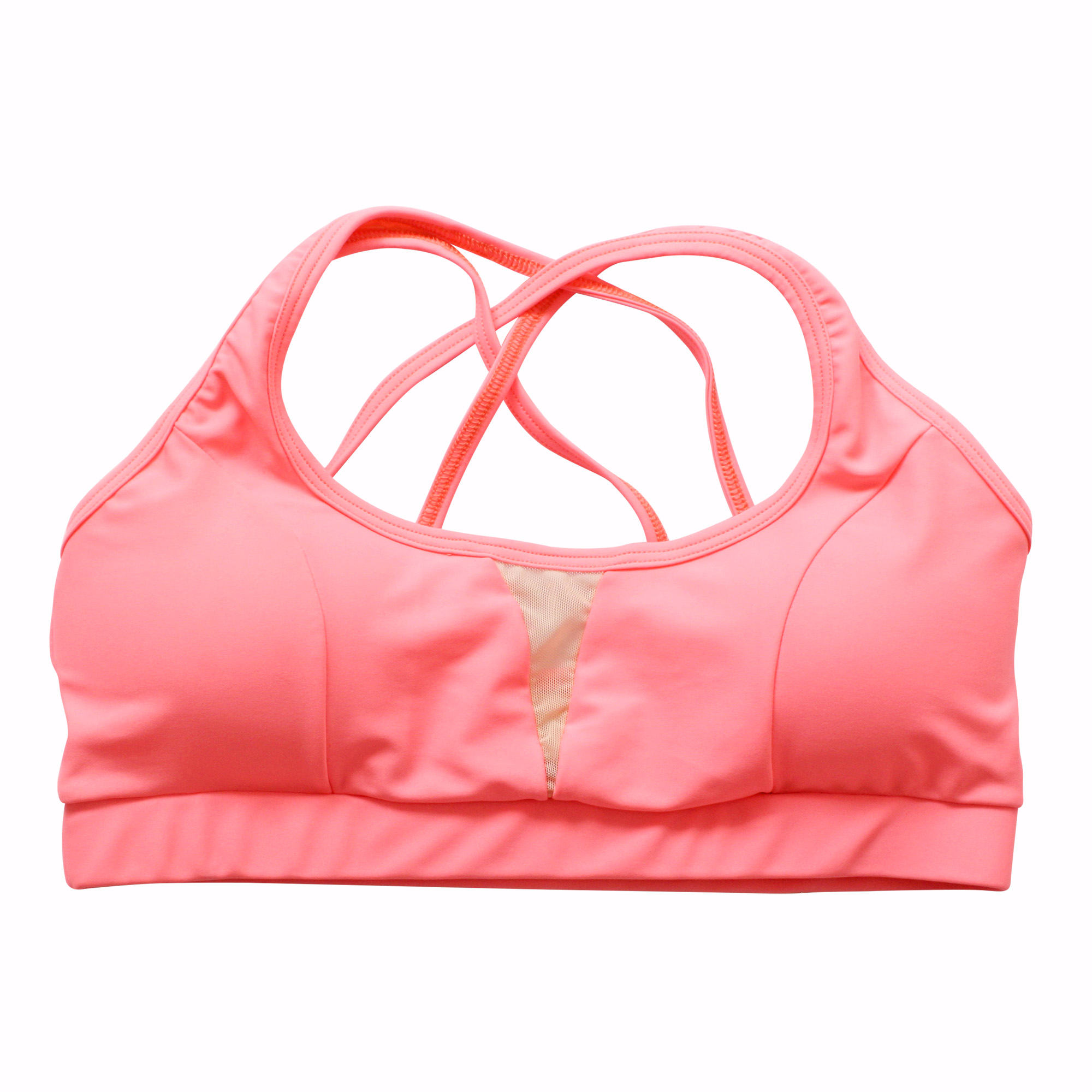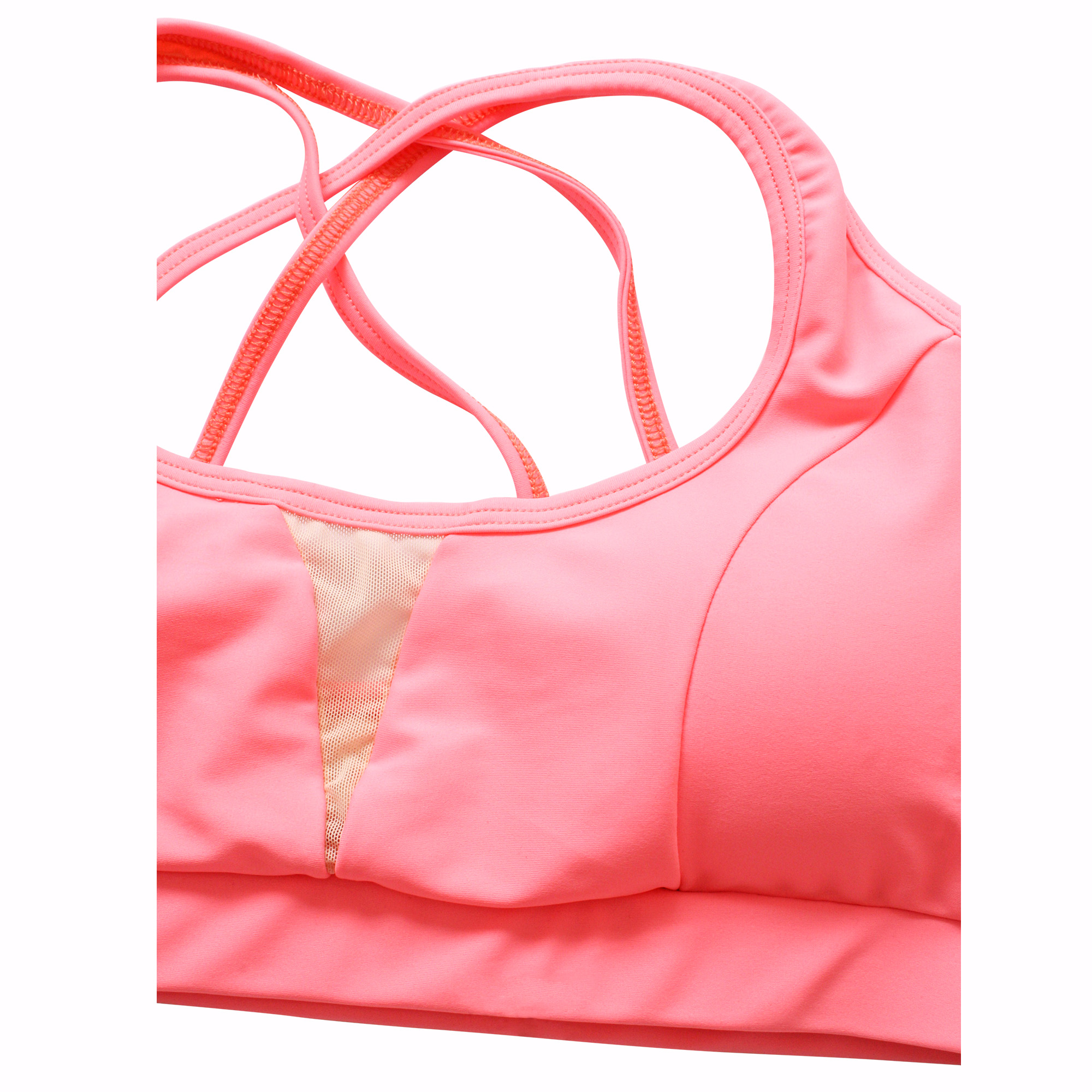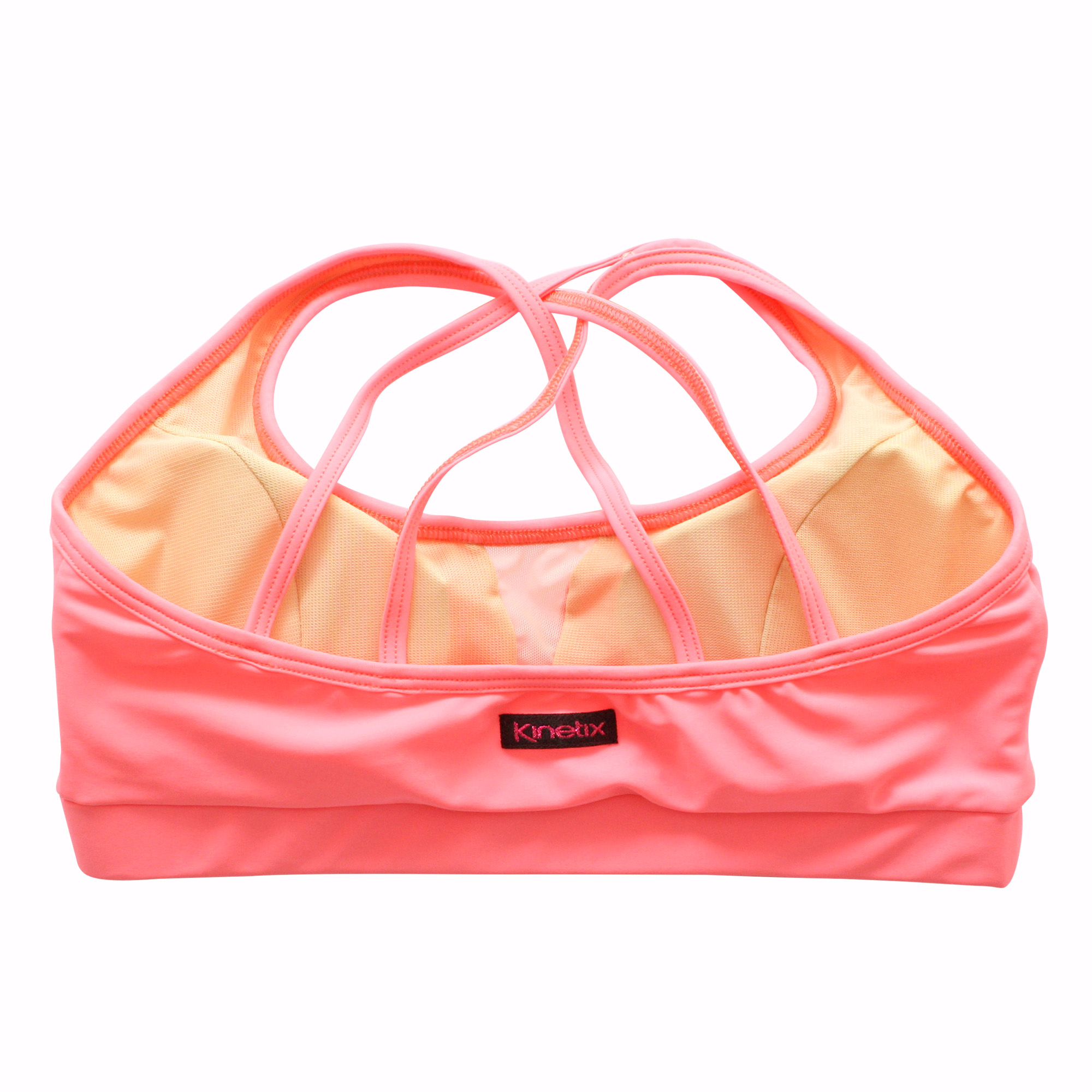 Top/sostén deportivo de telas deportivas: Lycra, aplicación de malla traslúcida, y forro color piel. Con tiras cruzadas en la espalda, copas flexibles y costuras para mejor forma anatómica y pretina con elástico para mayor soporte. Ideal para tus clases de danza, entrenamientos leves y para diario con tus conjuntos Kinetix.