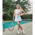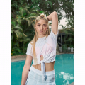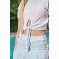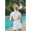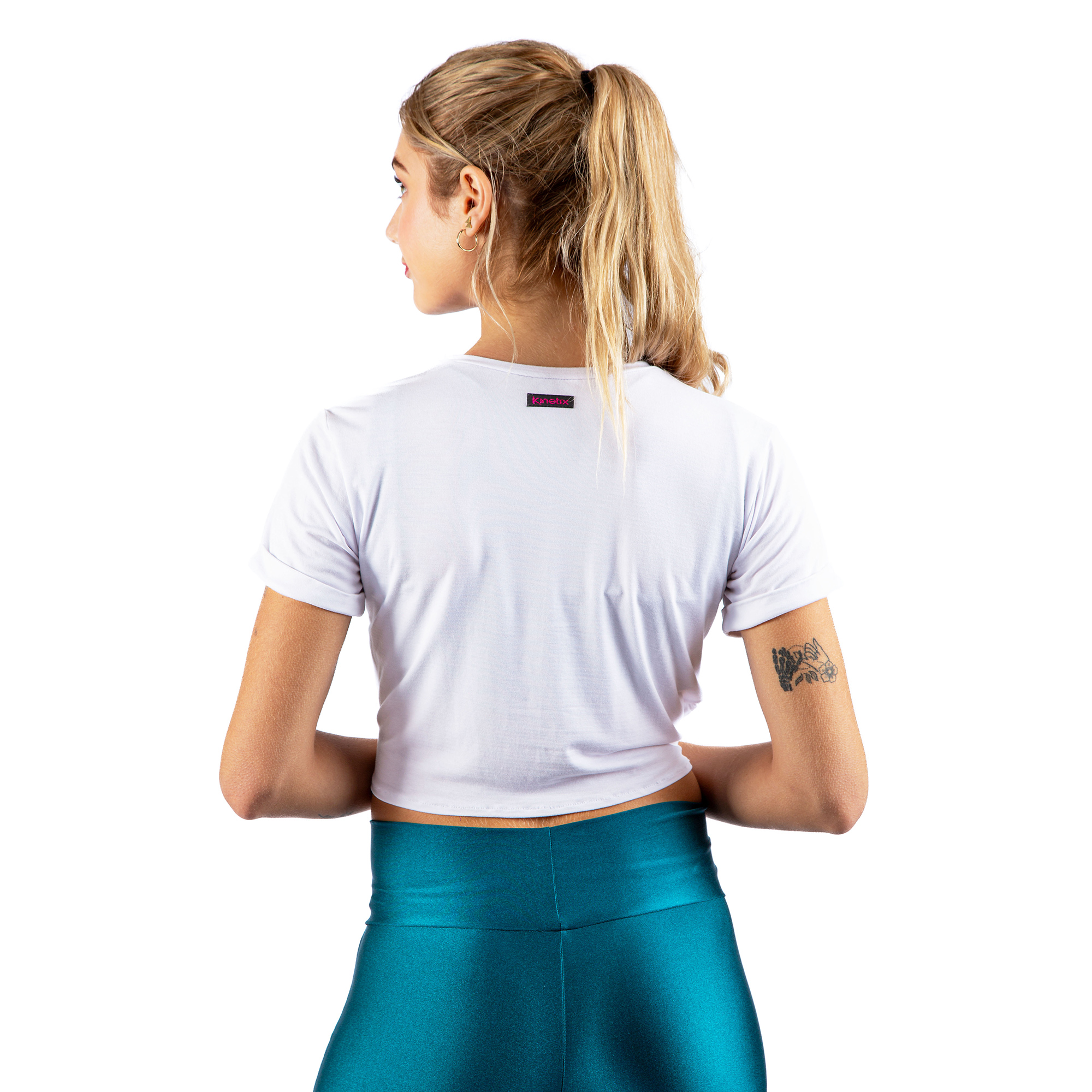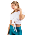Polo/top deportivo/casual a la cintura, de manga corta, color blanco, fit relaxed, delgado, fresco, muy suave al tacto y comprimible, con abertura pequeña en delantero con amarre de nudo modificable y recogidos a los lados. Combínalo con faldas, shorts, leggings o joggers Kinetix!